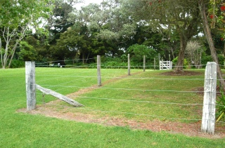 Along the north-east and south-east boundaries of the house lawns there are the remaining parts of a 5-wire fence that kept the stock, which grazed on what is now the Village Green, from the house lawns. A long-time standard in New Zealand for fencing grazing animals such as sheep and horses, the wire fence design has not changed much. The number of wires varies from 5 to 7 and the top wires were sometimes replaced with barbed wire to discourage animals from pushing against the fence and damaging it. The fence at Williams house is a replacement that was contsructed during restoration of the house. It uses standard galvanised wire fastened with hoop staples onto native timber posts and strainers, (all puriri), which stand a little over 1 metre high. The Far North District Council specification for the restoration stated that traditional materials and practices were to be used. For example: "All wire shall be No.8 gauge galvanised steel. All knots and ties shall be traditional fencing practice." The puriri posts and strainers were sourced from a farmer in Kaeo and the aged wood was not permitted to be cleaned, so they would continue to appear appropriately weathered. |